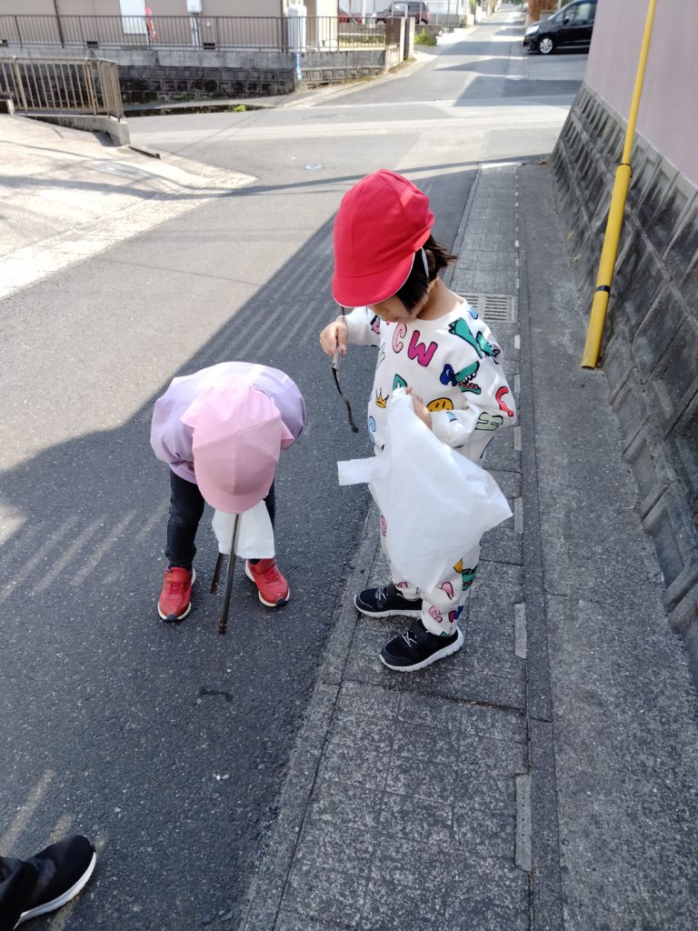 ゴミ拾いでは、ゴミばさみ用のトングを使って物を挟む練習から行い、それぞれトングとゴミ袋をしっかり持って出かけました。思いのほか近隣周辺にはゴミがあまり落ちておらず、地域の方が日頃からきれいにしているんだろうなと思いながらも、小さなゴミを見つけると「あったよー!」と宝物を見つけたかのように意気揚々と拾っていく子どもたちでした。ひと段落ついて帰ってくると、「まだしたかった。」とまだ満足していない表情ではありましたが、ゴミをあまり増やさないことや、自分の住んでいる地域もきれいにしようとする意識が高まった様子でした。引き続き、子どもたちの意欲を引き出しながら、できる範囲で地域周辺のクリーン作戦も継続していこうと思います。